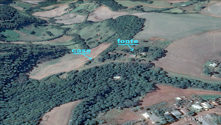 A casa ficava uns cinquenta metros abaixo da fonte, que fica atrás da casa atual. Devido à permeabilidade do solo a água da fonte não corria muito e entrava na terra de novo, o que obrigava a buscar água de balde na fonte, como acontecia lá na casa do vovô. Mas lá tinha uma vantagem, a fonte ficava num nível acima da casa, o que possibilitava o transporte por dutos impermeáveis como o cano da usina em menores proporções, é claro. O cano da usina era feito em sua maior parte de sarrafos de madeira, como são feitas as pipas e barris, amarrados por arcos de ferro aparafusados a cada metro no início, e a cada 30 centímetros no final onde a pressão era maior, finalmente um trecho era de ferro para suportar a pressão de 568 libras por polegada ou 40 Kgf por centímetro. Lá no tio Osvaldo não precisava tanta sofisticação, a solução estava nos matos que precisavam ser roçados.