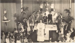 Prova que os vizinhos eram inseparáveis, no dia da primeira comunhão do Luís e do Valter. Atrás do altar estão o Seu Lino e a Dona Bazelides com o Luís e ao lado o Seu Adão com a Dona Dila e o Valter.
