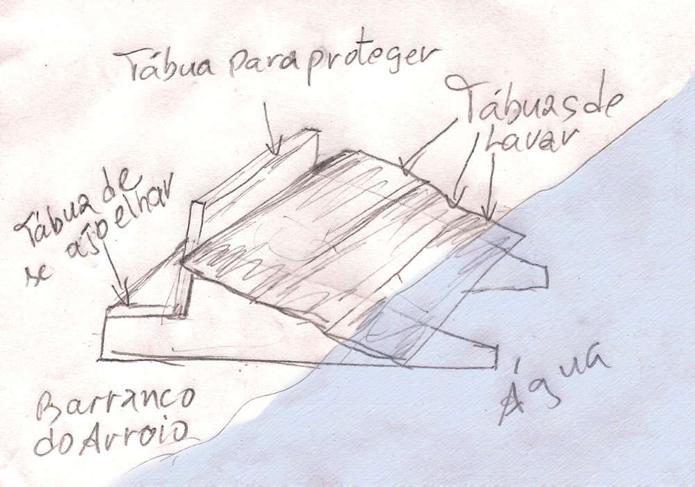 Lavador – Este dispositivo prático era usado para lavar roupas de joelhos no lado do arroio que o barranco terminava em zero, em geral do lado de dentro das curvas do rio ou arroio.