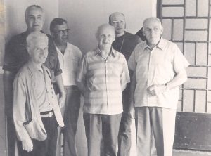 Padres pioneiros da província alemã. Da esquerda para a direita atras Pe. Paulo Stray, Pe.Henrique, Irmão Marcos, na frente Pe Theodoro Syberichs, Pe Guilherme Wetzel, e Irmão Eugênio. O Ir. Eugênio é do primeiro grupo de alemães que veio para o Brasil, o Ir. Marcos do terceiro, os demais do segundo grupo. na época da foto já eram falecidos os pioneiros Alfredo Engeltinger e Antonio Paul